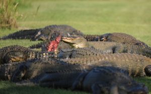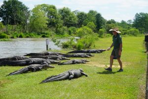 Everyday at 11:00 a.m., 1:00 p.m. and 4:00 p.m. we have our live feedings – a must-see event featuring dozens of our hungry alligators climbing ashore for a good meal from our staff! As soon as they hear the dinner bell ring, they make their way out of the water and onto the grass to catch a bite. You don’t want to miss this show!